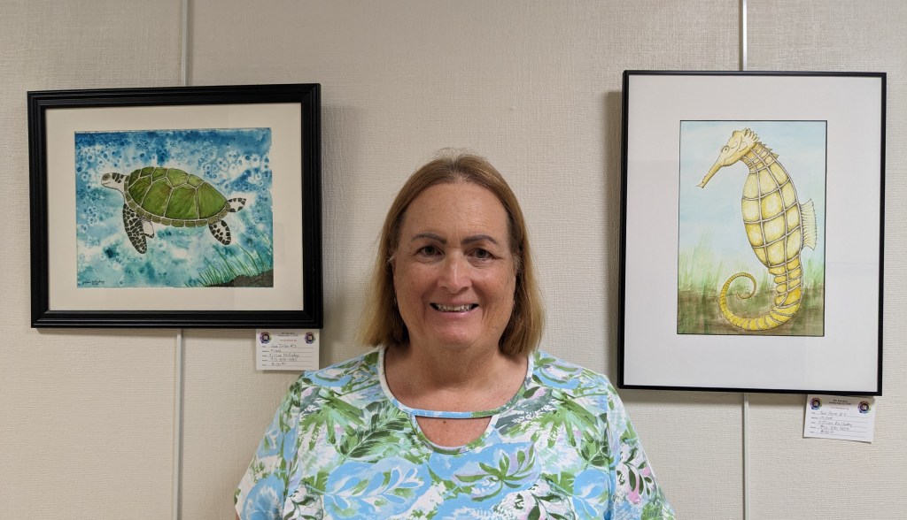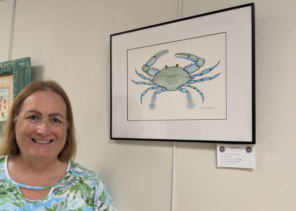My three paintings in the current exhibit are the aptly named “Blue Crab #2”, “Into the Mystic” (a sea Turtle off on a journey), and “Just Hanging Out” (a sea horse doing just that). All three are mixed media – a combination of ink stippling and watercolor, there may be a drop or two of acrylic here and there as well. All three paintings have a framed size of approximately 16×20 inches.